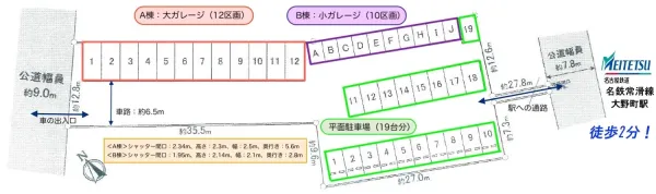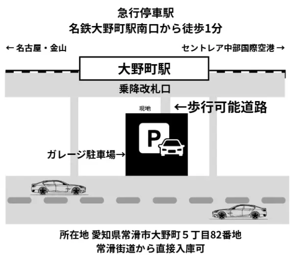 敷地内への車路幅6.5mあり、敷地内駐車場あり、切り返しがしやすい構造となっています。 常滑線大野町駅前に位置し、パーク&ライドとして使用できます。 セントレア空港まで急行9分、名古屋駅まで38分です。 現地見学はいつでも歓迎いたします。